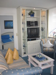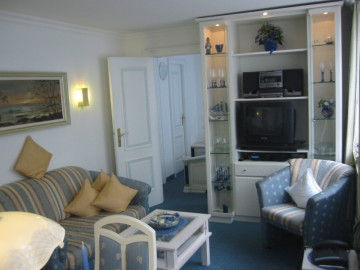 Die technische Ausstattung des Wohnzimmers ist mit TV, DVD-Player, Radio inkl. CD-Wechsler und einem Telefon sehr umfangreich.