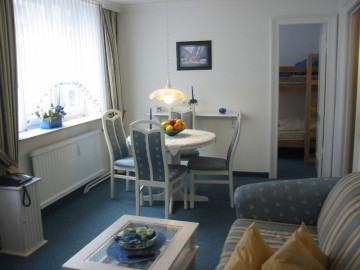 Im gemütlichen Wohnraum befinden sich Couch, Couchtisch, ein Sessel, ein Gläserschrank sowie ein großer runder Esstisch mit 6 Stühlen.